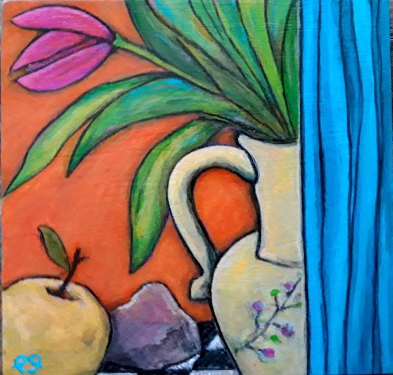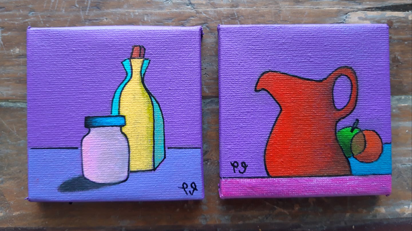 Miriam laat intrigerende stillevens zien die ze gemaakt heeft met houtskool of camera. Stillevens maar ook stil leven en fragmenten van ander werk. Judith heeft door drukte deze keer slechts een kleine bijdrage geleverd met geschilderde en getekende theepotten. Pieternel toont kleine werkjes die fragmenten uit haar leven verbeelden en stillevens van vroeger en nu, tekeningen en schilderijen. Uiteraard zijn er wederom zogeheten mini’s (schilderdoekjes op kleine ezeltjes) met het thema stilleven te zien.