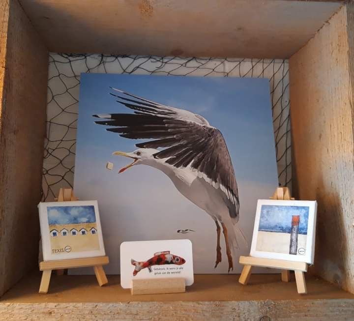 Ook bij VVV Texel en in het Kunstlokaal van Zout, in de Vermaning (augustus) en in de Kunst-etage (De Hollebol, Public Grill) hangt in 2024 werk van JARS en PG..... En bij Novalishoeve kun je uit de automaat een Pakje Kunst trekken, en als je geluk hebt trek je wat van ons. Misschien een inimini met een klaproosje, misschien totaal wat anders. Elke keer een verrassing.