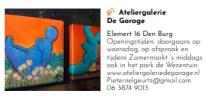De Garage bevindt op een locatie die supergoed bereikbaar is, tegenover de bushalte van Den Burg en aan een parkeerplaats. Op woensdagmiddag tussen 2 en 5 uur is de galerie open. In de maanden juli en augustus al vanaf 11 uur want dan is in het centrum tevens zomermarkt. Op afspraak via pieternelgeurtz@gmail.com ben je ook van harte welkom.