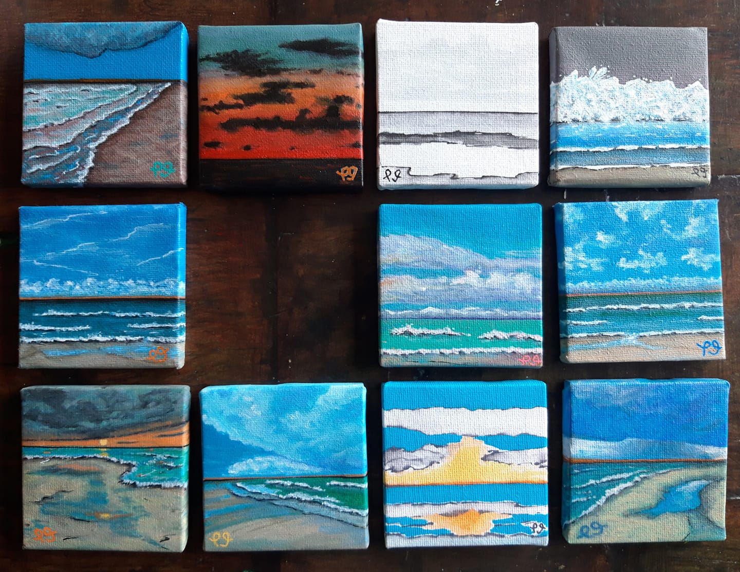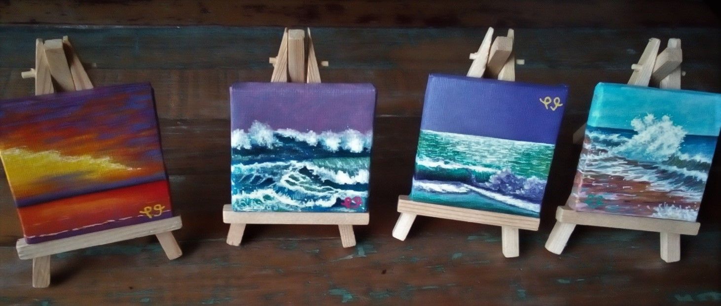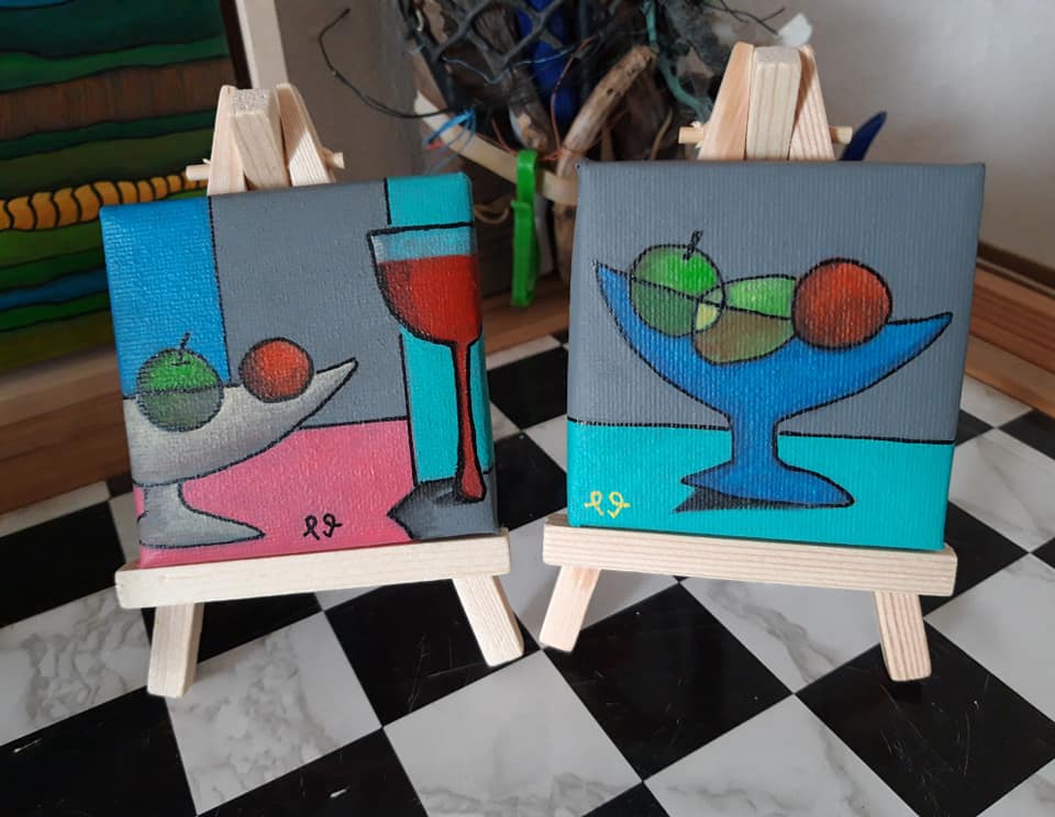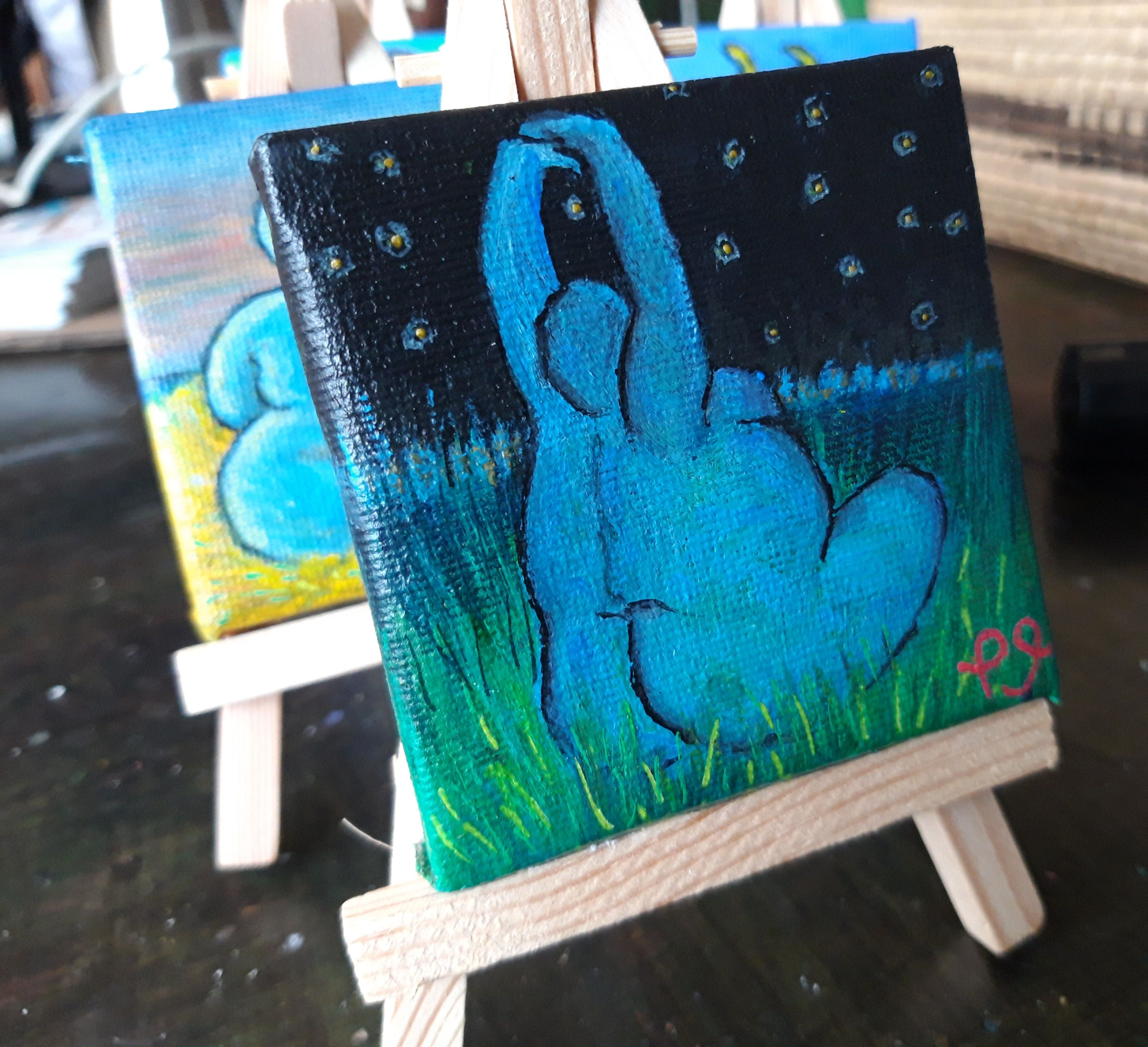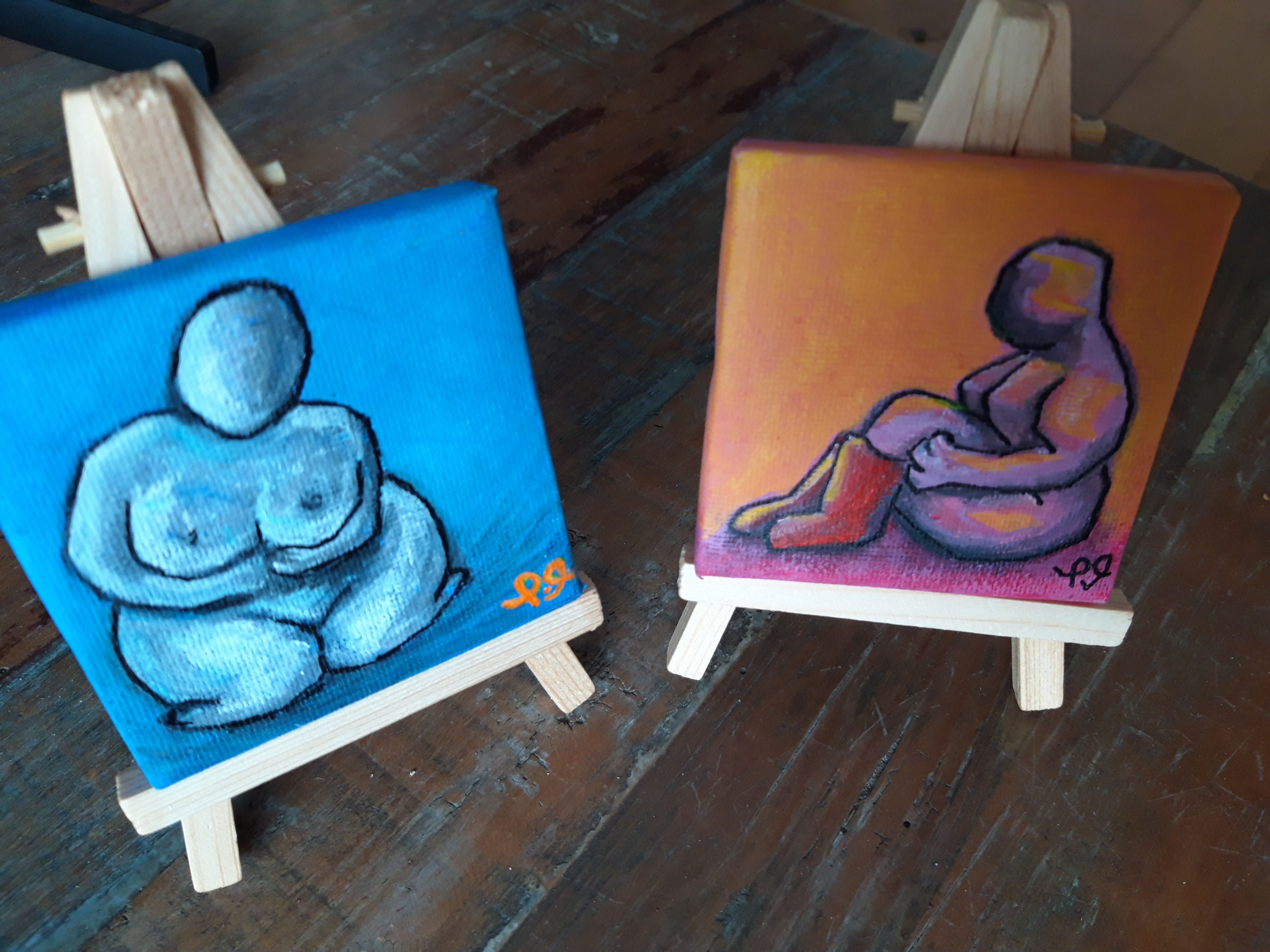 Dit jaar exposeert Pieternel (PG) vooral klein werk, ook Judith (JARS) valt voor het maken van mini's (7x7 cm) en de inimini's (5x5 cm). We hebben verschillende thema's, bijvoorbeeld: TXL natuur, onthaasten, sterrenbeelden en dikke dames. We hebben natuurlijk ook nog onze grote lijst met 104 schilderijtjes. Er zitten veel nieuwe mini's tussen. Ondertussen maakt PG ook kleine vrouwelijke beeldjes. JARS maakt kleine sculpturen. Kom vooral even kijken! Je kunt ook zelf een kleintje schilderen m.b.v. een foto die je gemaakt hebt (of een ansicht) en natuurlijk met materialen en aanwijzingen van Pieternel. Miriam (MvH) doet dit jaar voor maar een klein gedeelte mee. Kom kijken en geniet!