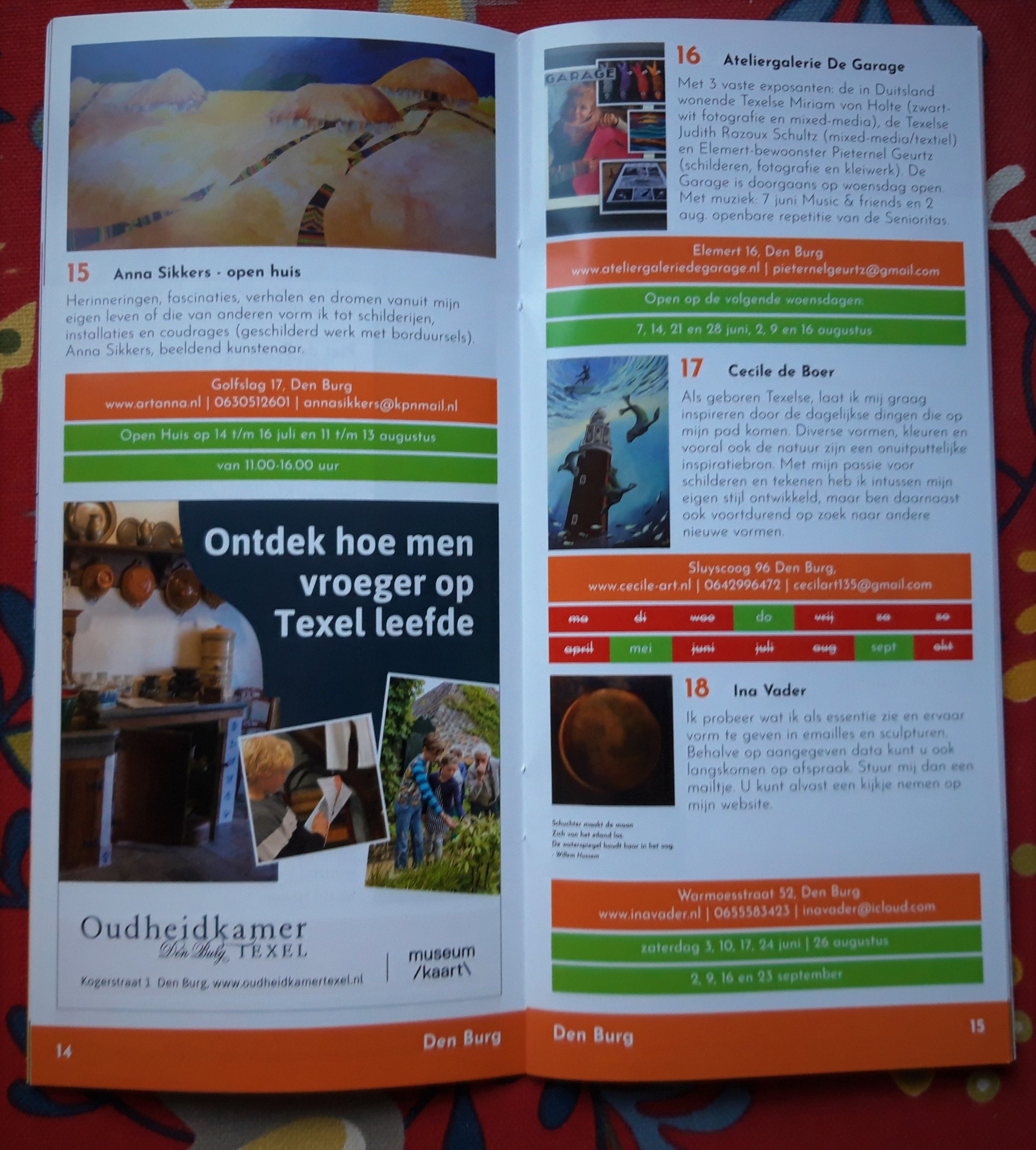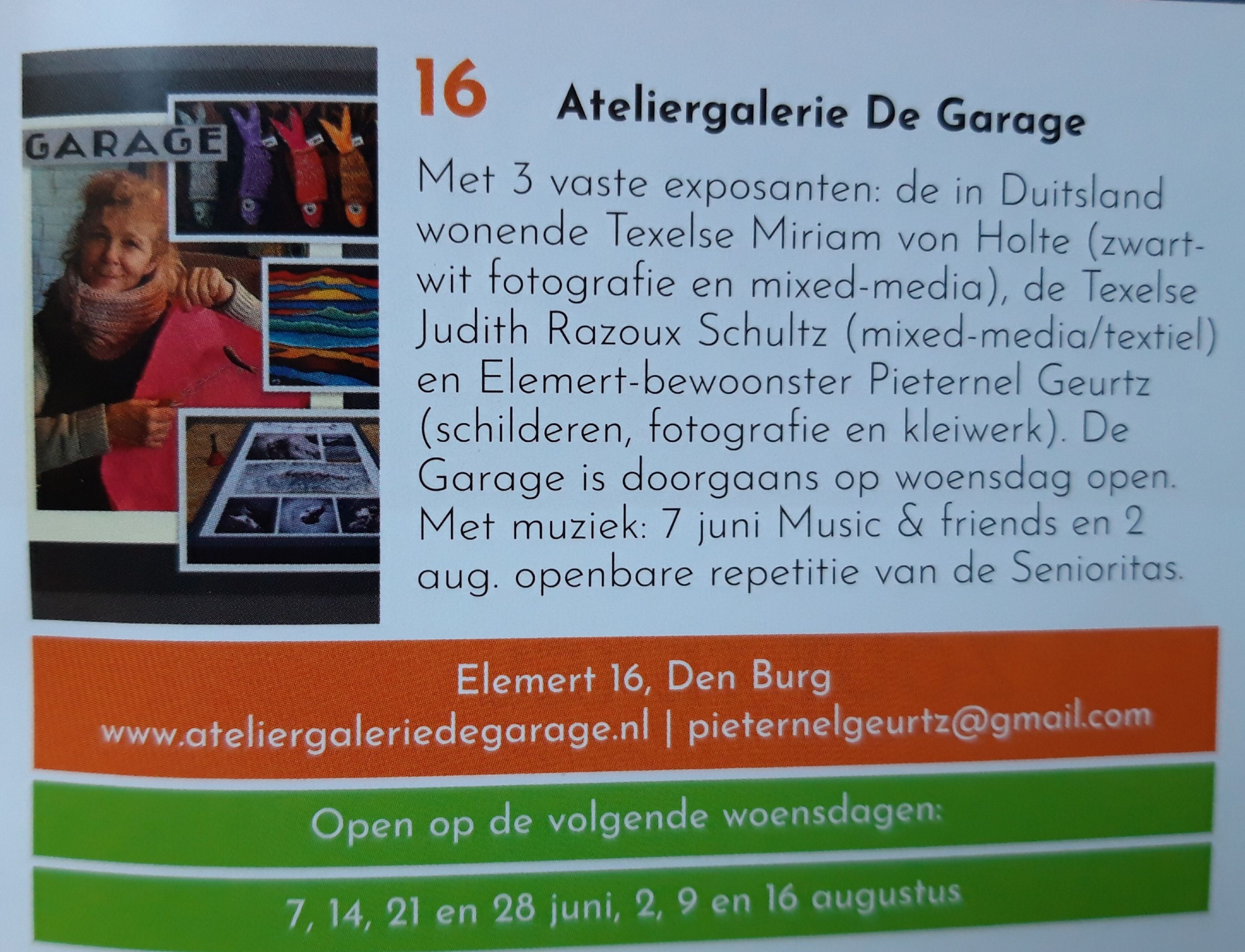 De Garage doet dit jaar niet mee aan de kunstroute in Den Burg die georganiseerd wordt door Kunstzomer/Cultuureiland. Die is namelijk op zaterdag. Als Pieternel thuis is dan "gooit" ze uiteraard wel haar deuren open! Wees welkom. Meer info over kunst op Texel tref je aan :